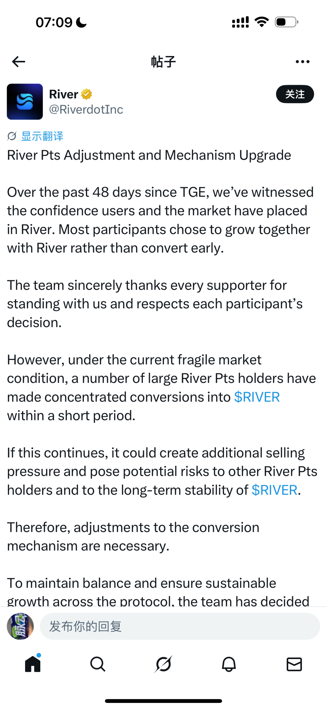- 又一项目爆雷!River Pts暴跌80%,项目方积分关闭兑换,合约锁死也能改?年底大批量项目开始收割!远离!