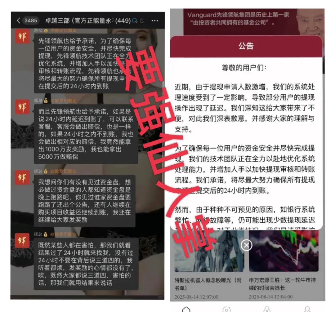 就在昨日,平台发布公告,提现被无限期延长,辉总还在试图稳定人心,不断向投资者保证一切正常,收益稳定,甚至还推出各种新活动,诱导投资者加大投入。但实际上,这只是他们为了拖延时间,许多投资者已经发现无法正常提现,客服也联系不上,投资群更是被悄然解散,种种迹象表明,“Vanguard先锋领航”资金盘已经彻底跑路。