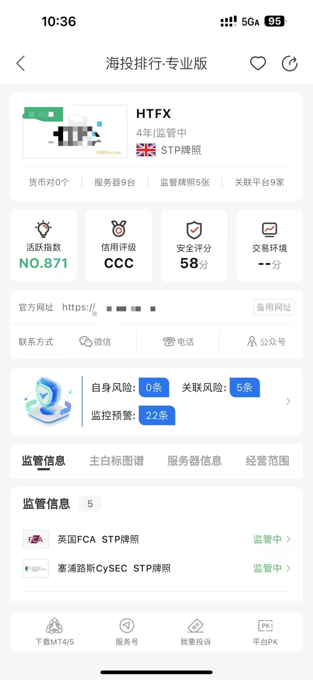 根据第三方外汇平台安全性查询软件海投的数据显示,HTFX排名871,成立年限4年,该平台拥有5个国家的监管牌照,但具体情况需要进一步核实。(这一评分仅供参考,投资者在选择平台时应综合考虑多种因素。)