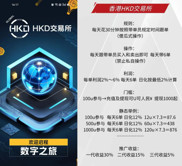 套牌HKD交易所上线于2025年7月底,玩法是合约跟单。HKD以日化12%和分销体系诱人入局,每日签到赠送0.5U,最低门槛100U,体现最低140U,先小利后收割。其套路包括碰瓷正牌香港交易所、数据造假、限制提现、卷款跑路。此类平台是庞氏骗局,必崩盘。大家查清平台、看透收益、守住弱点,陷入骗局要止损、取证、报案,勿信暴利承诺。