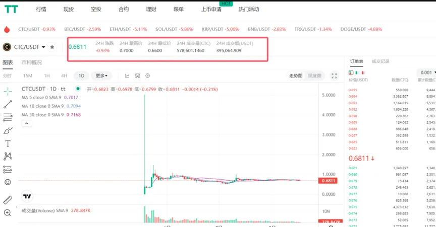 所以我们可以看到,这个天体交易所CTC的交易量24小时连40U都没有。