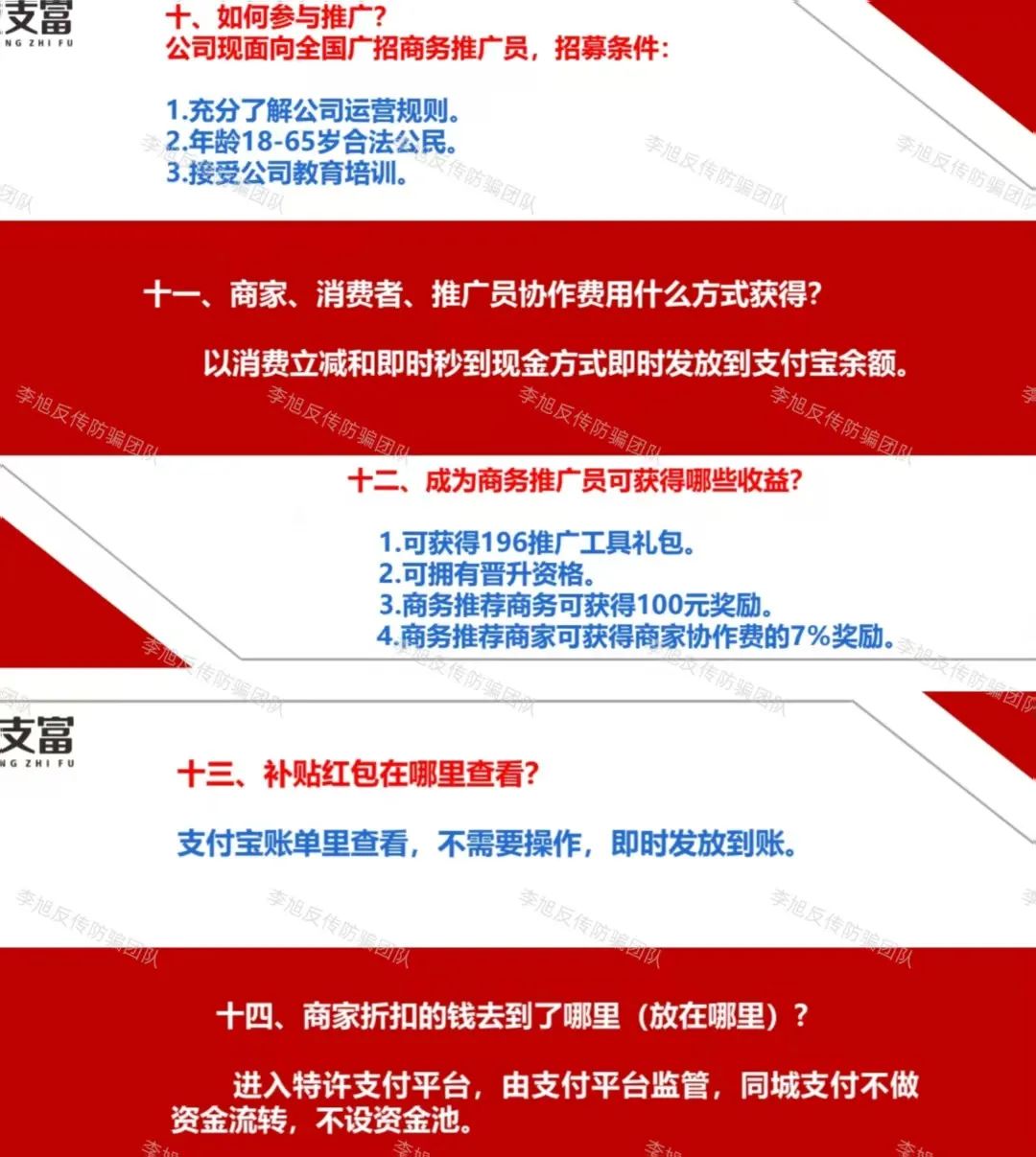 宣称作为某支付公司服务商,通过连接商家与消费者,以推广员推荐获奖励、商家协作分佣等方式运营。