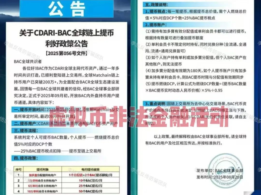 根据公告可以看出,提币需扣除 25% BAC作为税点,相当于直接拿走四分之一。还要燃烧对应价值5%的DCP代币。其价值由项目方操控,等于让用户用“空气”换“空气”。