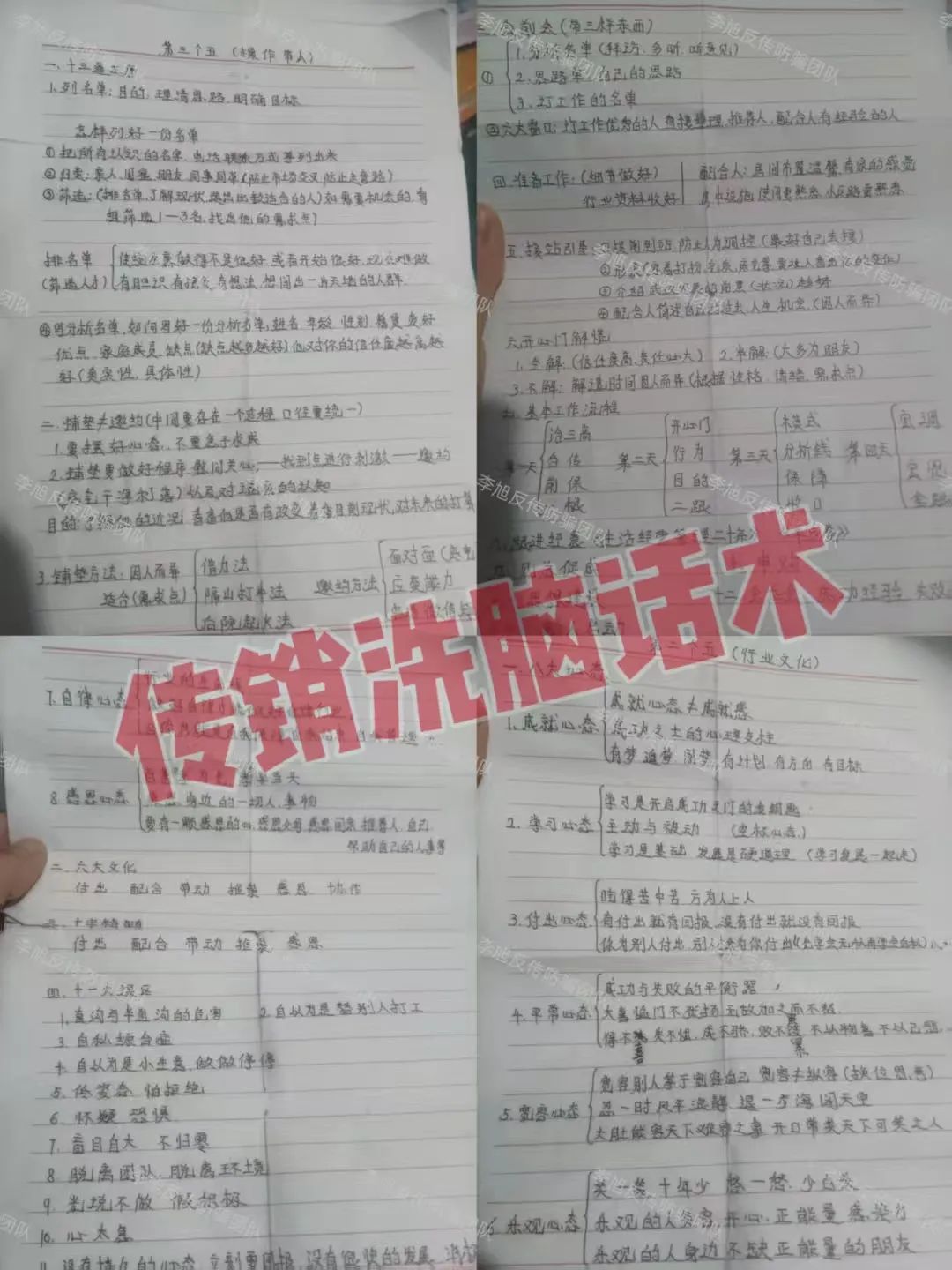 但网友发现一份家人秘密保存的手稿,其中大量涉及“八大心态”“十一大误区”“开心门”等制度解读。而这些内容,均来自于传销组织“洗脑”课程。