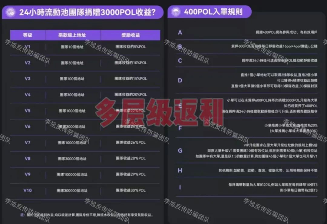 通过“捐赠”不同档位的“POL代币”获取获得静态收益。动态设置“推广层级”,拉人可获得多代返利,层级越高、收益比例越高。