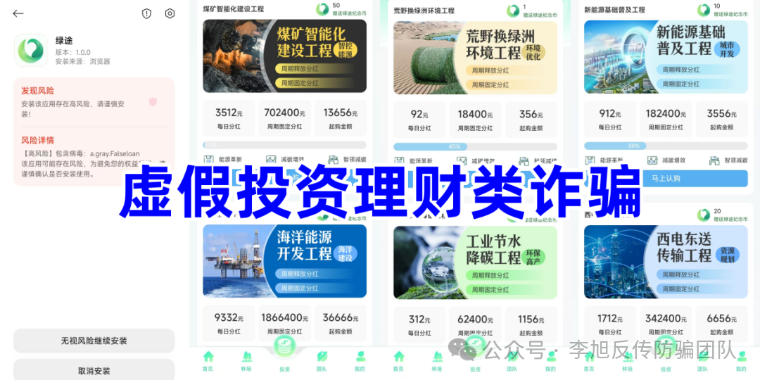 起初只是虚构推广一些“新能源基础普及工程”等高额返利的虚假理财产品。后续又推出了“绿途币”虚拟货币。
