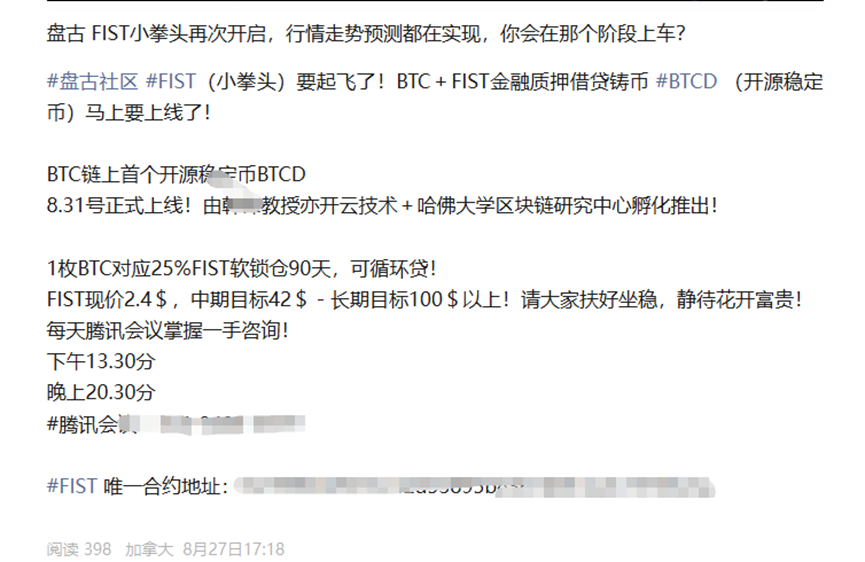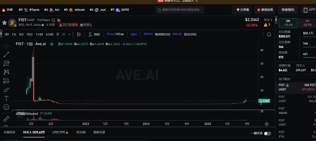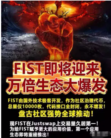 所谓的小拳头币项目,不过是沿用过去FIST拳头的概念。历史资料显示,FIST又名小拳头,被宣传为由一群国外技术极客开发,作为社区治理代币,总量仅10000枚。这种极度控盘的设计本身就是为操纵价格服务的。