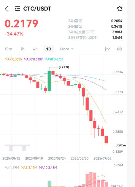 公告发布后,天体交易所的平台币CTC瞬间暴跌99%: