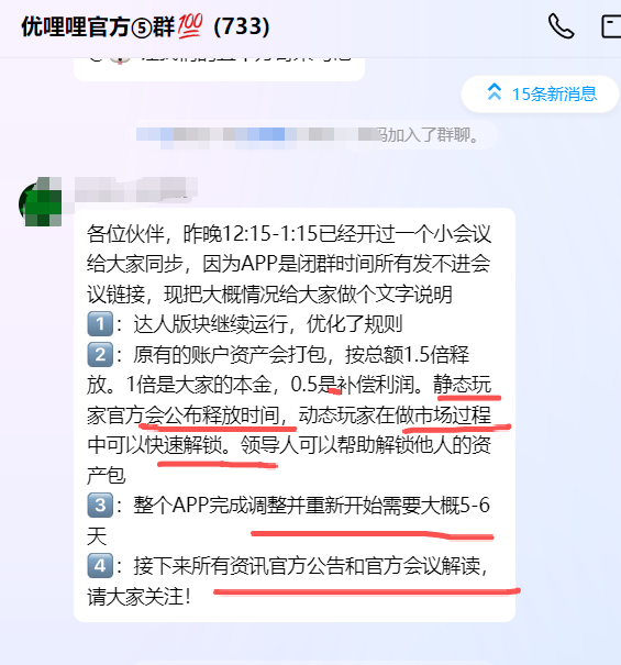 前天晚上,为了维稳,优哩哩召开线上大会,本来大家都以为是宣布系统开启,继续奏乐继续舞,没想到是继续升级继续等: