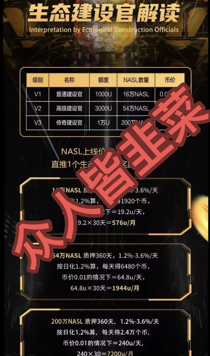 听不懂就对了!这帮人玩的就是这招,真要让你整明白了,还咋忽悠你往里跳呢?说白了,这就是个披着虚拟币外衣的投资陷阱。震哥仔细扒了扒它的玩法:让你先质押NASL币,号称日化收益能到1.2%到3.6%。按宣传图算,投1000U拿16万币,每天能领1920个,要是币价稳住0.01U,一天赚19.2U,一个月下来576U——看着俩月回本还有赚,对吧?但天上能掉馅饼吗?投资哪有稳赚不赔的?