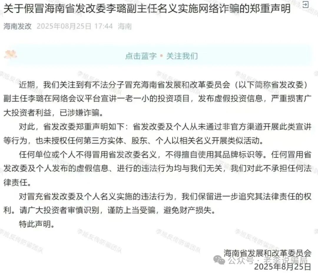 8月25日,海南省发展和改革委员会发布声明,证实系有人冒用副主任李璐名义宣讲该项目,涉嫌诈骗!