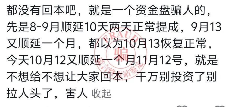 每一个资金盘的套路都是一样的,一开始以虚假的超高收益产品诱人入局,刚入局时给你点甜头,诱惑你拉人投钱,等到后期,一方面不断疯狂推出所谓产品,优惠力度越来越大,另一方面,会通过种种手段和借口,限制提现。这往往是资金盘面临终局的征兆!
