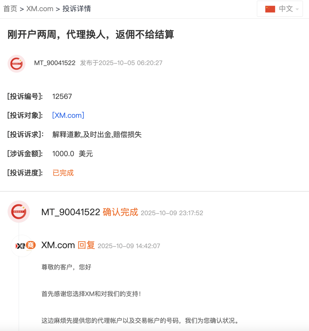 很快,XM客服的回复姗姗来迟,语气客气得如春风拂面:“尊敬的客户,您好!感谢您选择 XM 并对我们的支持。请您提供代理账户及交易账户号码,我们会尽快为您确认状况。”这封邮件看似诚恳,但没有明确的时间表,也未解释为何代理人更换导致佣金延误。换句话说,回复虽“到位”,但解决仍“待定”。