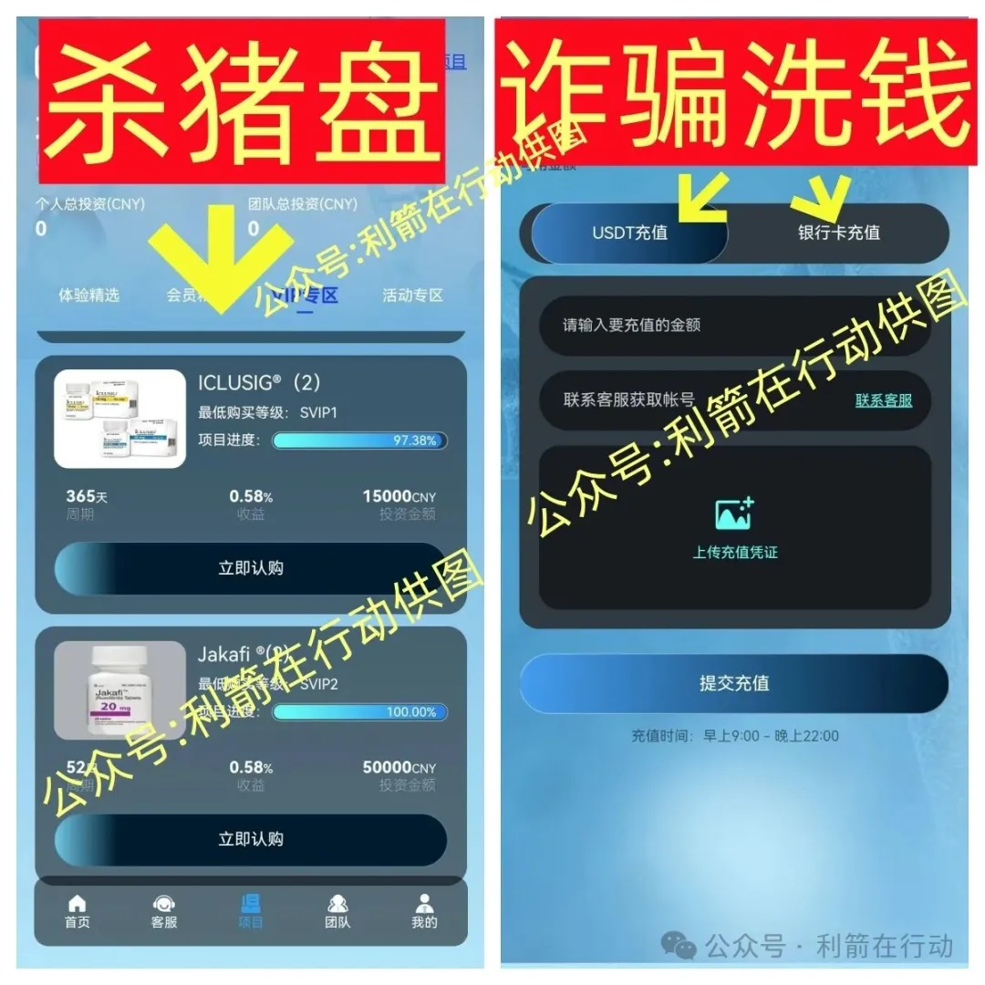 进入“lncyte”APP中,看到了最低交6000元的“投资项目”,15天就能连本带息返回来,收益是0.75%,会员精选中的周期是70天与120天,“投资”金额是1万元与18000元两种,VIP专区最长时间是365天…………妥妥的杀猪盘,充值收款是虚拟币与银行卡转账两种方式,还要上传打款截图,这是诈骗洗钱的杀猪盘。