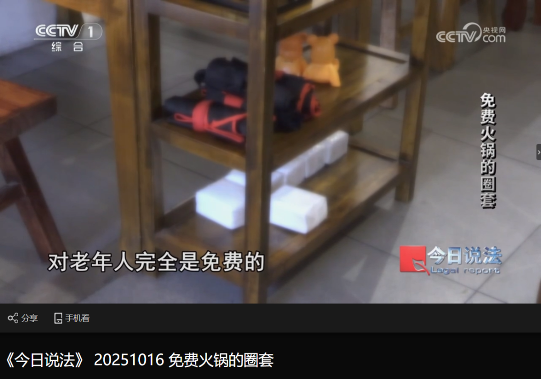2025年10月16日,央视《今日说法》栏目播出“免费火锅的圈套”引发广泛关注。内容揭露一个盘踞在浙江杭州的诈骗团队,以接待老年人到火锅店免费用餐为诱饵,逐步引导老人投资所谓的“内蒙古养牛项目”。