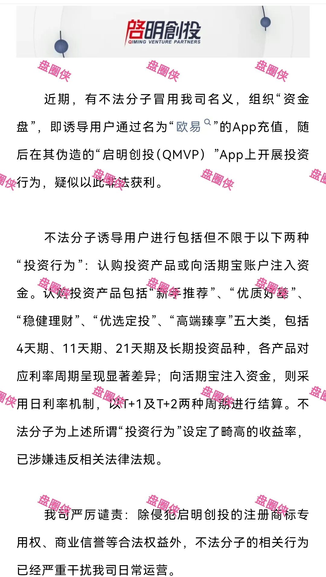 启明创投:假冒启明创投公司名义进行诈骗活动的分红类资金盘项目骗局。启明创投官方公众号已多次发布声明该APP系不法分子冒充用于从事资金盘诈骗活动。