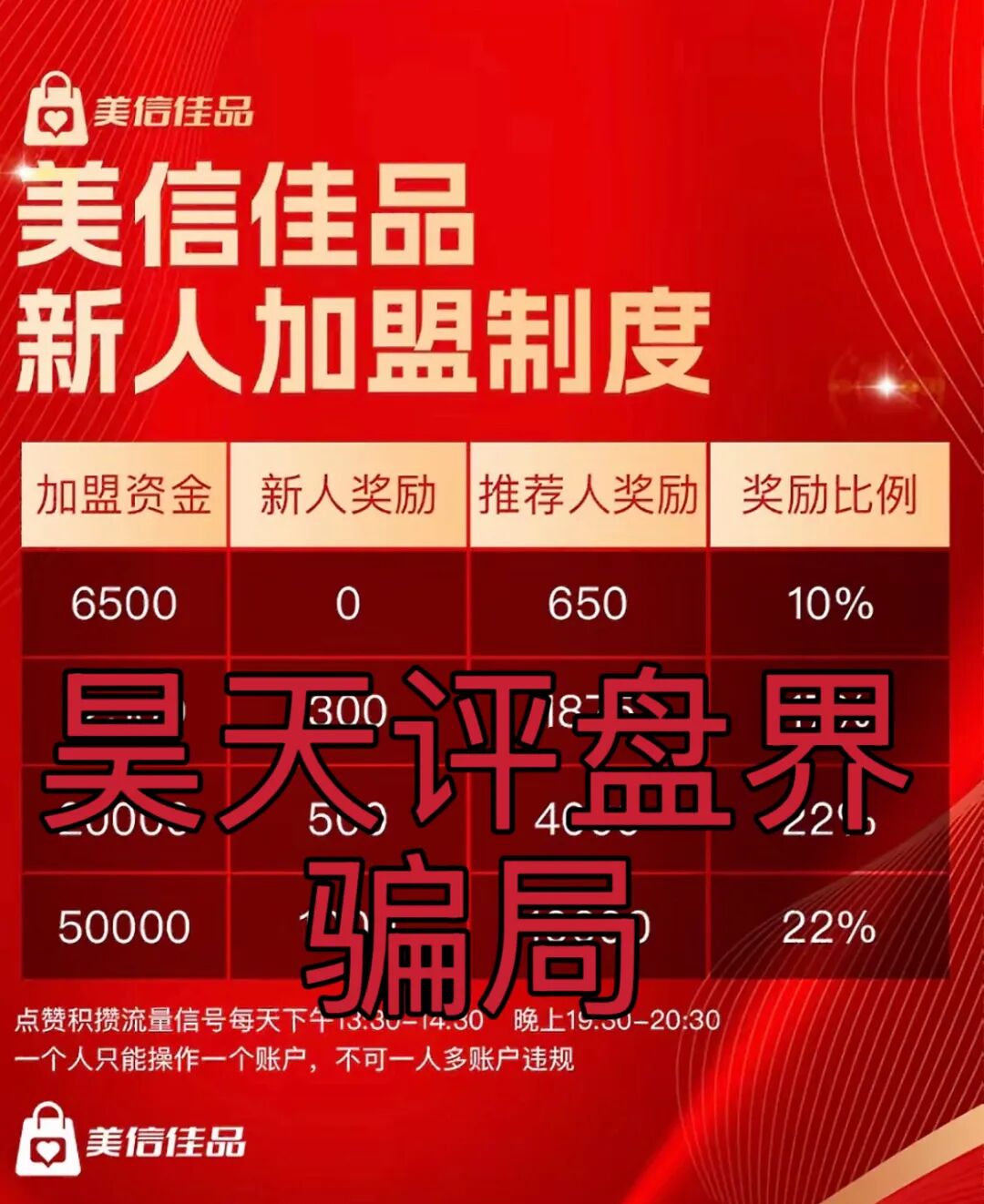 昊天评盘界友情提醒:美信佳品冒充电商的跟单分红类资金盘骗局,大量单割会员,操盘手李昊明诈骗过亿,高度预警,即将崩盘跑路!近期知乎,小红书,微博,抖音等app都有冒充昊天的诈骗团伙,除公众号外其他一律不是本人,我们不推广任何项目,大家切勿上当受骗!