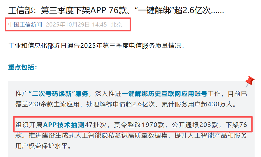 近日,工*信*部发布通告,2025年第三季度下架了76款违规App。(↓点击下图查看全文)