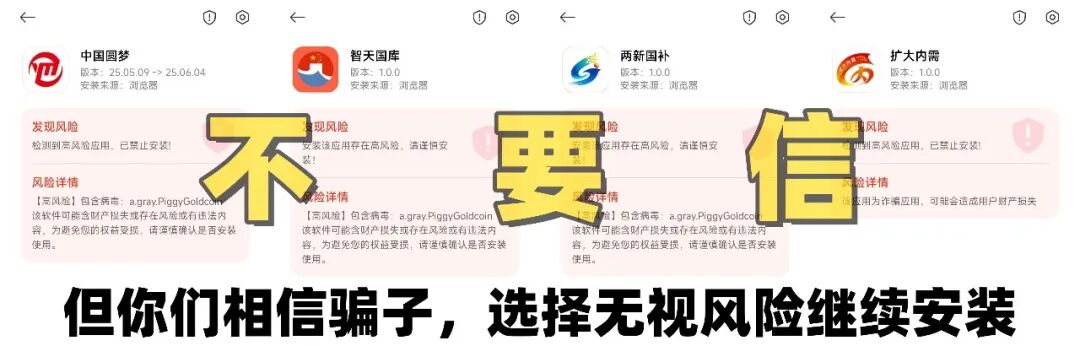 需要特别强调的是,这些涉诈APP没有任何备案,均出自境外!不能通过官方应用商城下载,且下载时,都会有风险提示。