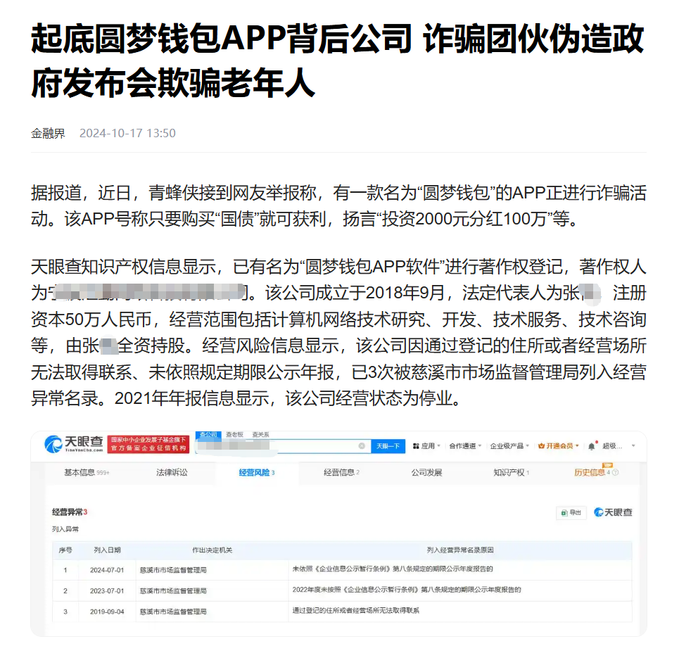 还有一些诈骗团伙,会利用虚假信息注册公司,冒用他人身份备案,并频繁更换App名称和图标,逃避追踪。比如“圆梦钱包”背后的公司,早就因为“通过登记的住所无法联系”被列入经营异常名录。(为了避免这么诈骗团伙恶意举报投诉,我们只得隐去一些关键信息)