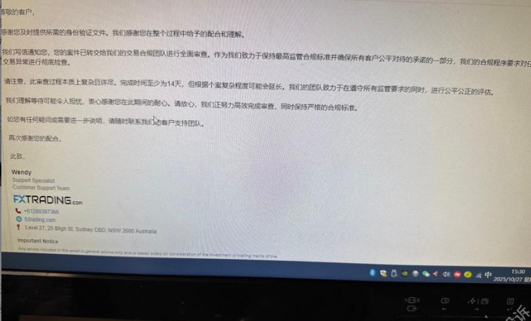 A某称,其出金申请未能即时成功,并收到平台邮件,要求其验证个人信息并录制视频。A某表示,自己已按照平台要求完成了上述操作。随后,平台再次发邮件告知,其账户因存在异常情况,需要进行调查,调查周期可能需要14天或更久。