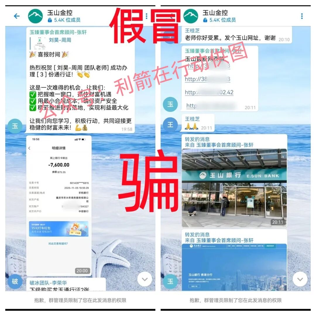 今年6月6日玉山银行发出通告:《关于不法分子冒用玉山金融控股股份有限公司及玉山商业银行股份有限公司名义进行诈骗事宜的严正声明》