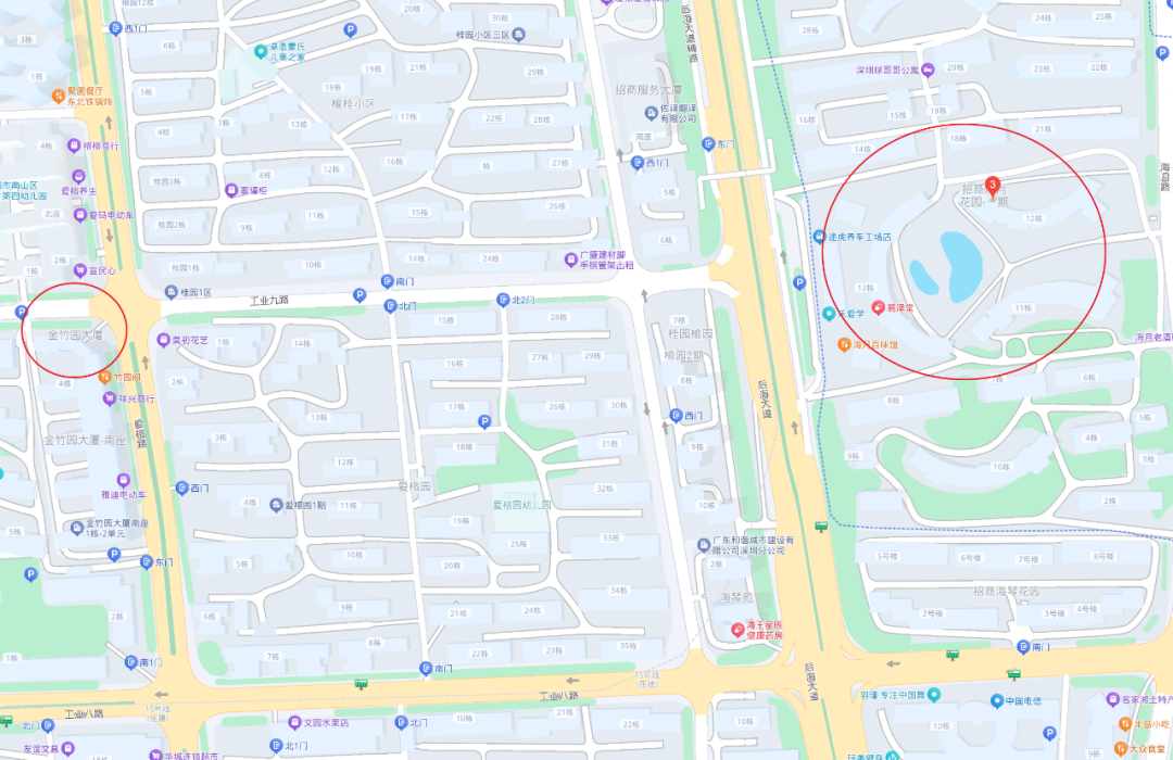 谎言终点站通过百度地图,找到这个所谓“楼盘”的地址:深圳市工业七路8号招商海月花园(下图右边的圈为楼盘, 左边的圈为金竹园大厦)