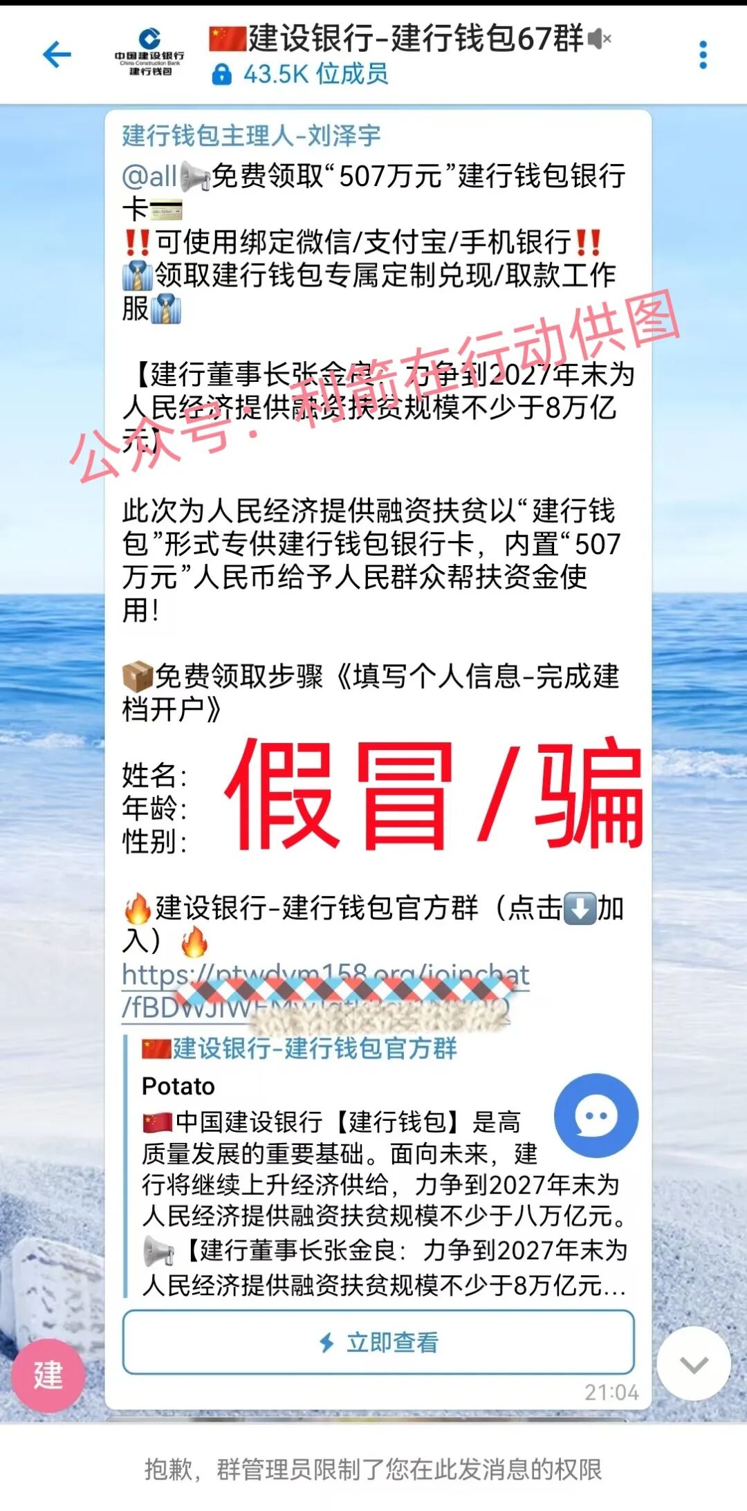 假冒建设银行的“建行钱包”免费领取507万元是民族资产解冻类诈骗项目,远离。