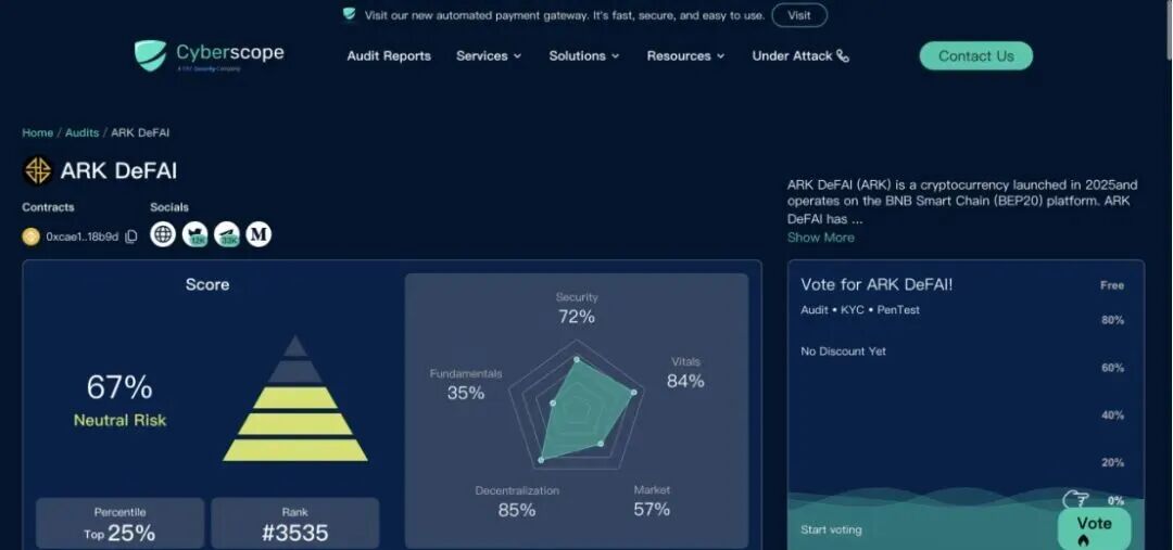 ARK 的宣传里,整天大喊“全链审计通过”,听到这话不少人还以为他们上的智能合约都被查遍了。可事实是,CertiK 只验证了两份合约(TransparentUpgradeableProxy + ARK token),并没有包括资金池、治理合约、代理权限类合约。而 Cyberscope 扫描结果还表明这些合约仍是可升级、有权限控制的状态,说明审计并没有真正封锁后门,