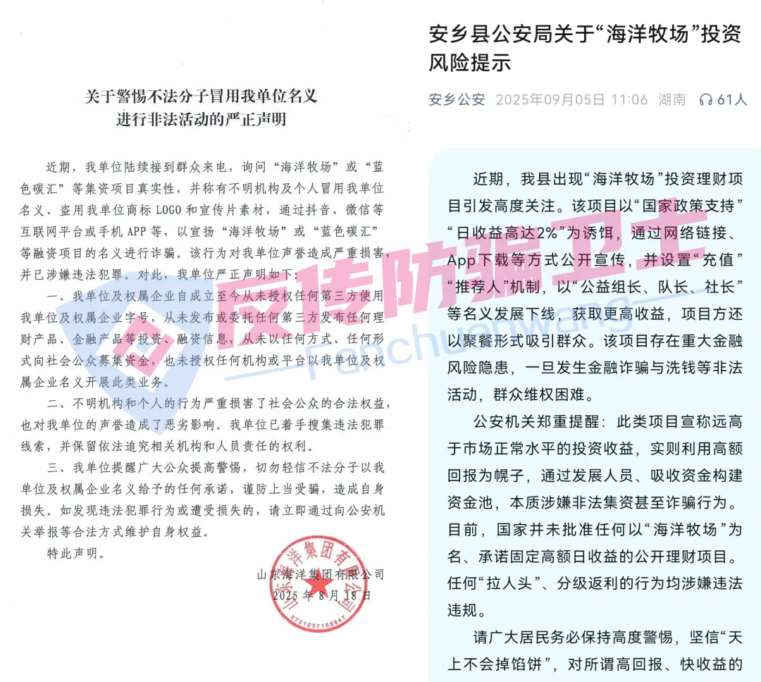 再次,山东海洋集团8月份就已经发声明打假,安乡公安也发了风险预警。话都说到这了,如果你还再执迷不悟,那只能是活该被骗。