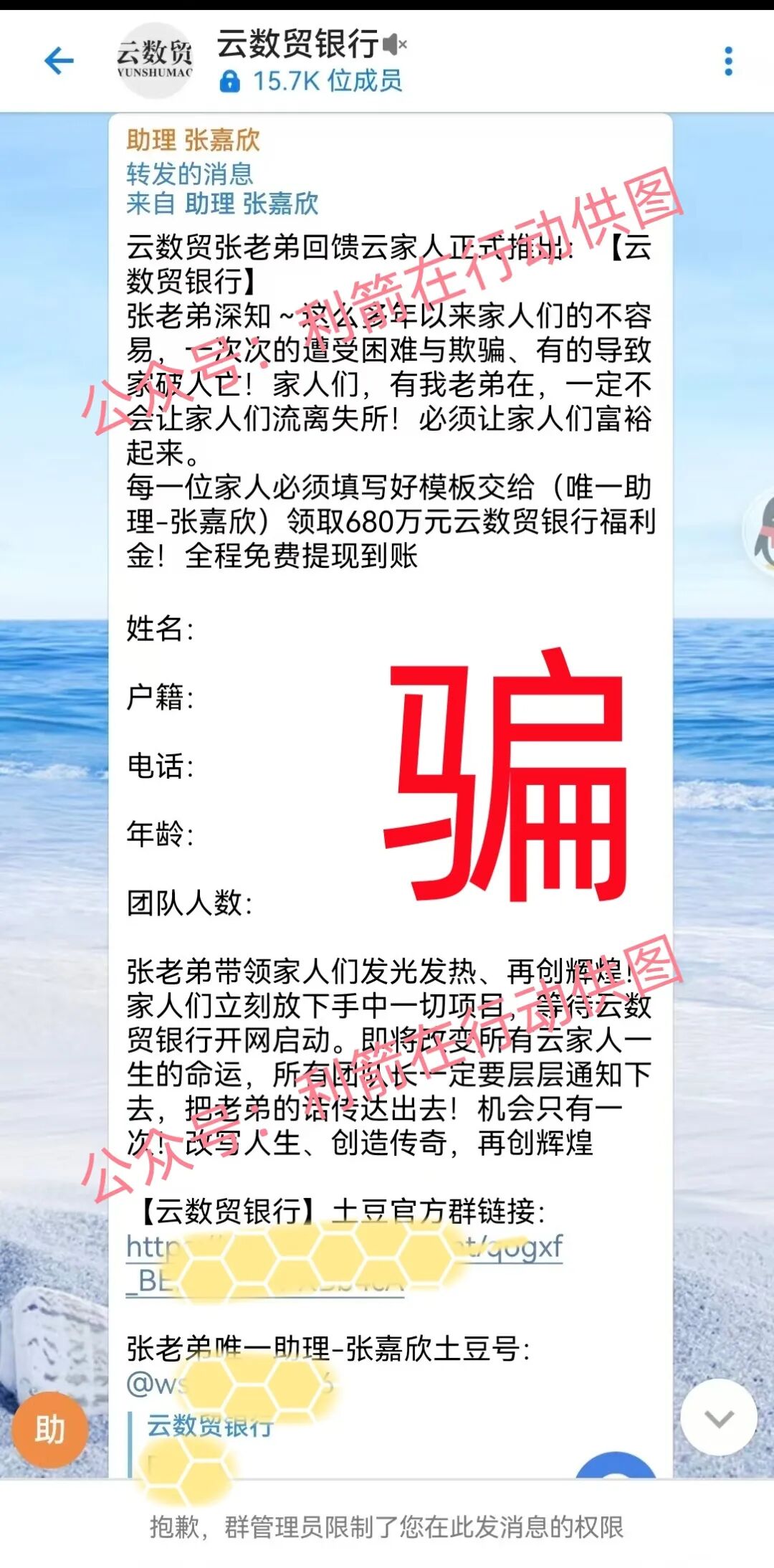打着“云数贸”旗号,伪装成“云数贸张老弟”(指云数贸张健)的骗子在群里面忽悠不明真相的人提交身份信息,谎称只要填写报单模板,就要发放680万元“银行福利金”?这是典型的民族资产解冻类诈骗项目,我国没有云数贸银行,云数贸张健还在狱中服刑,刑期要到2029年结束,请大家不要上当被骗。