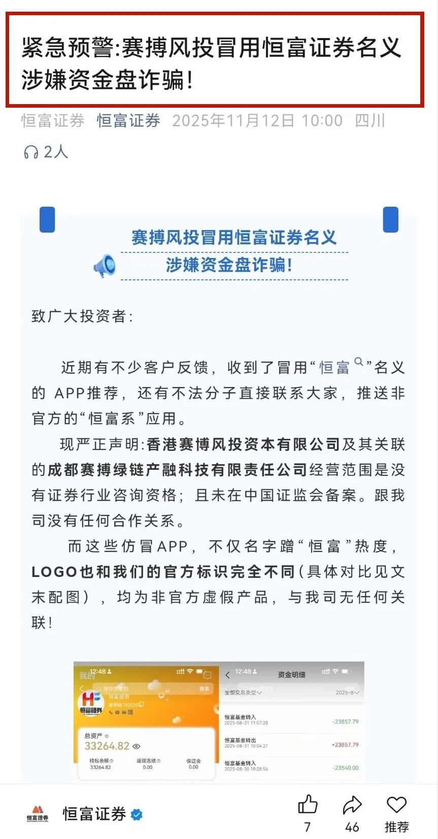 11月12日恒富证券微信公众号发文《紧急预警:赛搏风投冒用恒富证券名义涉嫌资金盘诈骗!》,该文中明确提醒:赛搏风投APP系假冒,是资金盘诈骗。
