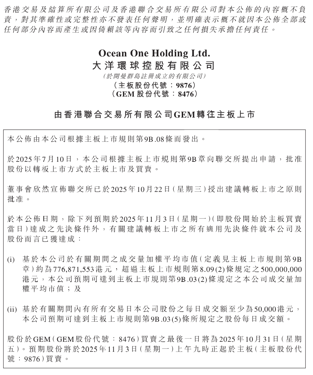 2025年10月23日,港交所批复转板申请,并同时公布主板的新代码9876,(注:港交所一般略去前面的0)。其中清楚写明将于10月31日停牌,11月3日九时在港交所主板上市交易。