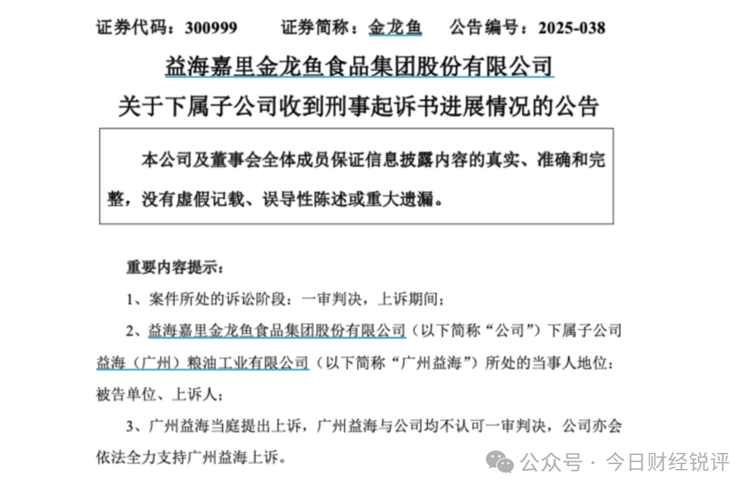 值得注意的是,近期金龙鱼子公司还被卷入合同诈骗风波,11月19日,金龙鱼公告,公司下属子公司益海(广州)粮油工业有限公司(以下简称“广州益海”)收到淮北市中级人民法院作出的(2024)皖06刑初3号一审《刑事判决书》。