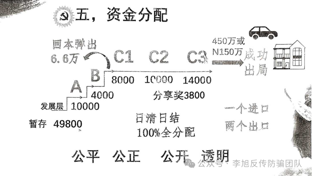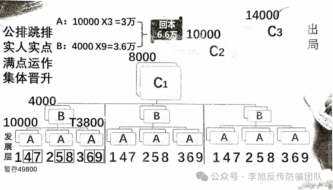 宣称“无资金池”“百分百分配”,用数字相加等于49800元迷惑参与者,实际绝大部分资金被高层分走,广大中下层都是被收割的韭菜。