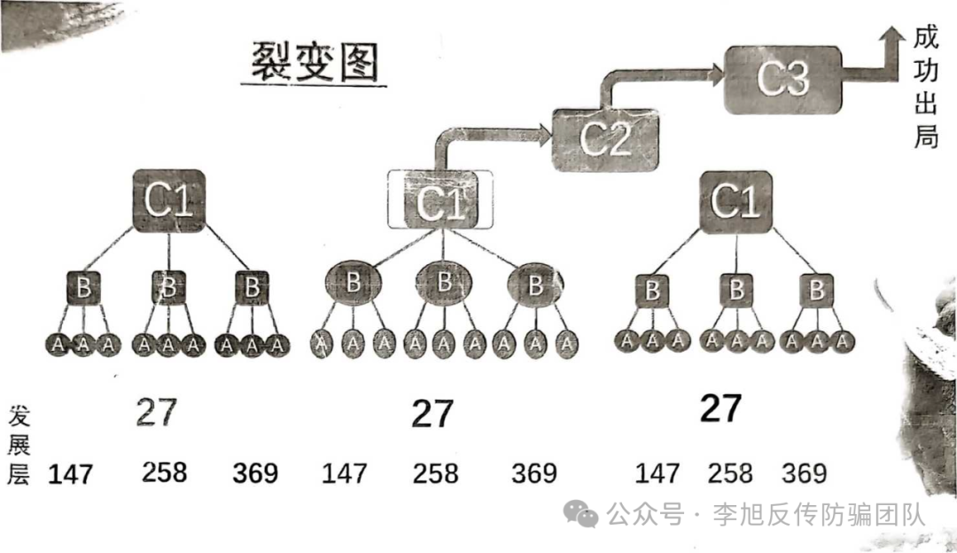 以C3为顶点,向下裂变:1个C3 → 3个C2 → 9个C1,每个C1需发展27人(3个B×9个A),形成金字塔结构。