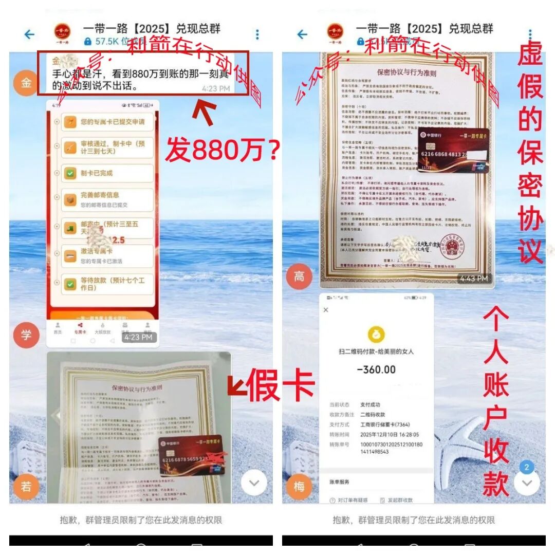 在“一带一路【2025】兑现总群”里面非常热闹,不少中老年人在交钱“开通大额放款通道”?而收款的人全是来路不明的个人账户,这与宣传是“国家项目”明显不符,有不少托儿在群里面晒单,发了收到800多万元到账的短信通知,还有人发了虚假的“保密协议”…………………….