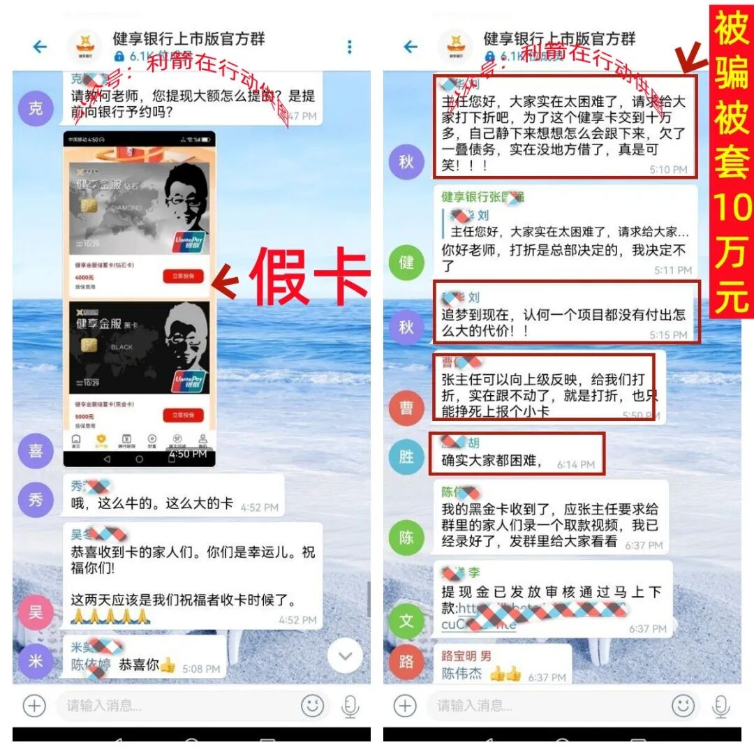 提醒:“健享银行黑卡”是假卡,是诈骗道具,无论交多少钱,永远都不会提出钱来,这是永远不会兑现的骗局,赶紧报案吧,