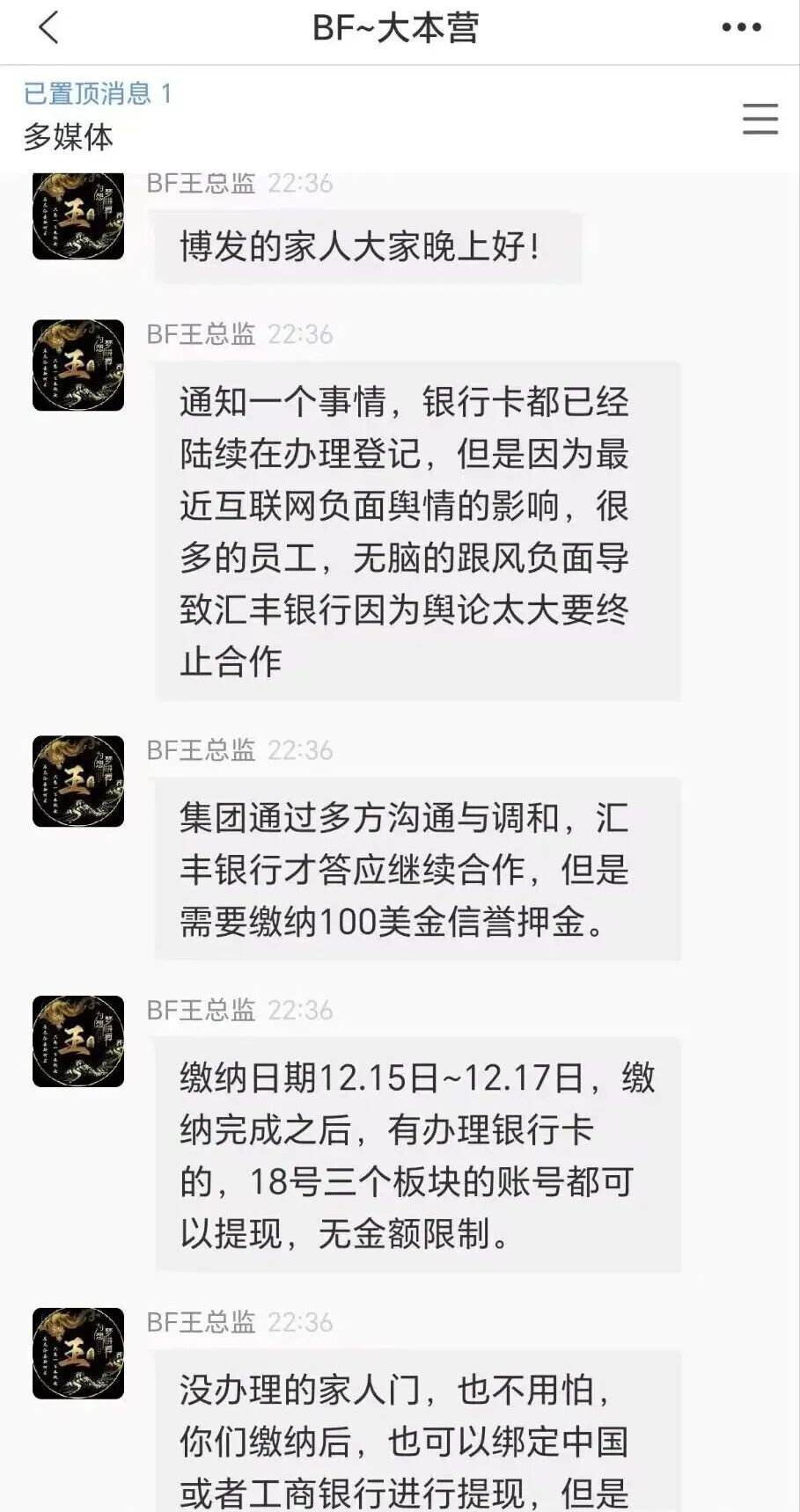 关于在“博发”该平台爆雷之前,良心弟也就多次发文,老王又要收割了,办理所谓对外账户,就是套路的开始,这不就今天又来不及继续在群里忽悠韭菜,很对博发投资者,大多数都是会充值。