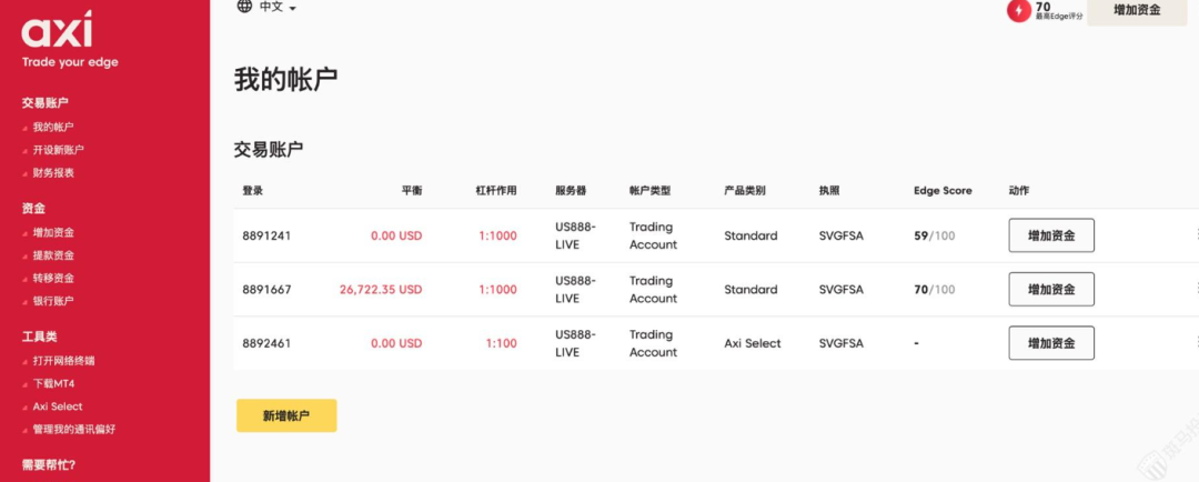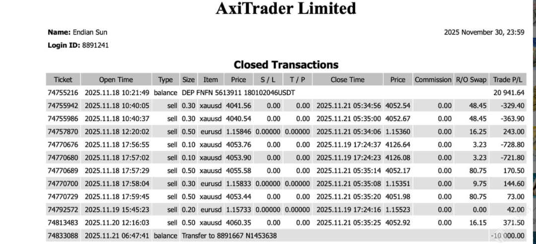 A某表示,我是AXI注册客户,相关账户8891667,8891241。本人在2025年11月17日注册开户,并在11月18日入金20941.64美元并进行交易。