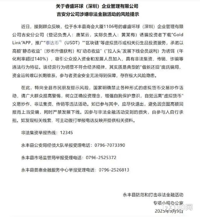 事实上,早在今年9月上旬,永丰县专项小组办公室就已发布风险提示,明确指出 “Golden Link”APP 具有庞氏骗局特征。