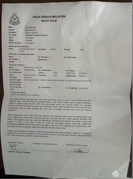 据A某提供的后台数据显示,相关三个账户共扣除资金共计约111,828.13美元(5007335扣除账户资金$42,530.38,5006789扣除账户资金$30377.09 ,5007245扣除账户资金$38920.66)。A某认为平台“未经授权清零资金”,对此表示不认可,目前已向马来西亚警署报警立案。
