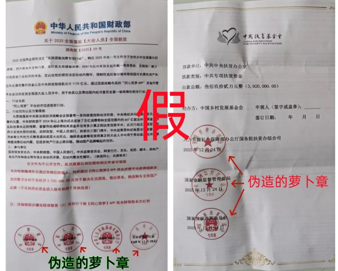 收到这种虚假的292万元发“扶贫”款的快递,被要求扫描二维码下载软件,这是“同心筑梦”APP,这种软件的网站往往搭建在境外,有的还能控制下载人的手机。骗子利用一些人的想领到292万元“扶贫款”的心理进行精准诈骗,一些人银行卡上的钱被盗走,有的人帮助骗子转移诈骗资金,成为“电信诈骗工具人”。