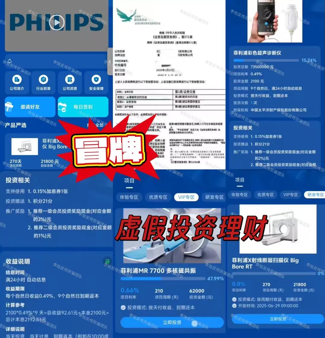 冒充“PHILIPS飞利浦”名义,推出虚假投资理财项目,每日收益到期返本。推荐新人投资享一级2%、二级1%收益。同时发行FSP期货债券,以高额收益吸引参与者认购投资。