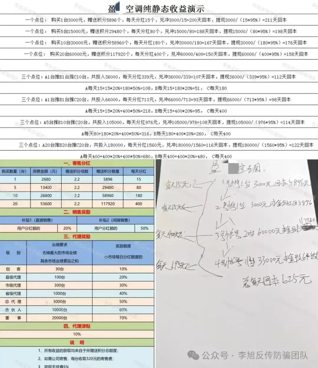 打着寄售空调旗号,混淆消费和投资概念,3千元每台,交由公司寄售每台收取320元寄售费。根据用户消费数量赠送2.2倍积分,逐日释放;直推20%,间推50%,并根据业绩划分7个代理级别,最高可享70%补贴,变现手续费5%。平台虽然宣称空调销售,但用户采用寄售模式获得高额利润,每日返息到期返本,真实销售情况不可知,实属变相理财,涉嫌非法集资。