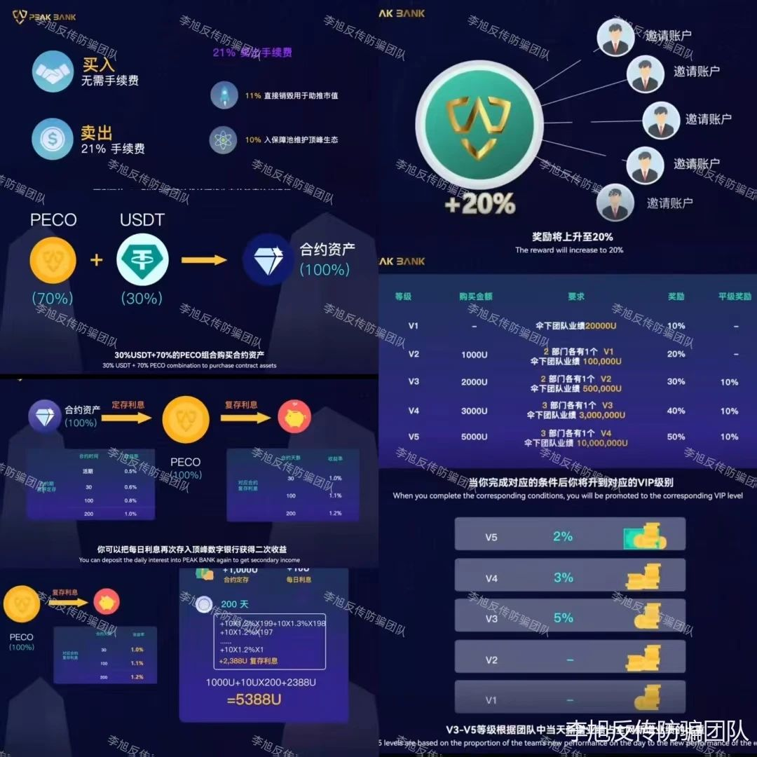 通过“PECO”虚拟货币开展交易时,卖出操作需承担21%的手续费。用户可采用30%USDT与70%PECO的组合方式认购合约资产,根据合约期限的不同获取差异化收益比率,收益以100%PECO的形式按日发放,若将收益进行复投,可获得更高收益率的额外回报。引荐新用户可获取10%的奖励,当成功引荐5人后奖励比例提升至20%,达到规定的充值额度与团队规模后可晋升至VIP等级,享受团队奖励、平级奖励、额外分红等多项激励。该模式具备传销活动的典型特征,其虚拟货币炒作行为属于非法金融活动范畴,已涉嫌构成非法集资。