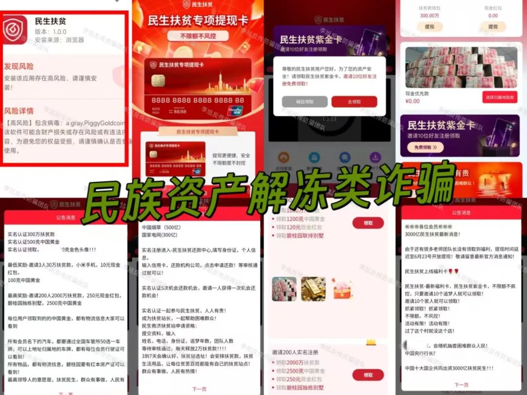 冒充国家机关宣称实名注册并邀请10人可领取“紫金卡”,每天释放2万扶贫款。每人拥有5次还款机会,每邀请一位新人增加一次。同时根据邀请人数额外获得扶贫款、黄金、现金甚至房产奖励。该APP下载提示未备案且携带病毒。
