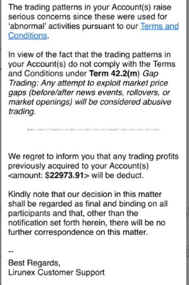 B某表示,我在该平台交易,于周一盈利后提交出金,然而到周四晚间未到账,这时,平台周四晚间来一个“重要通知”邮件,声称我利用价格跳空获利,扣除我22973.91美元盈利。