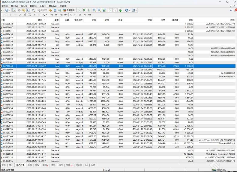 A某表示,其2025年12月9日-12日入金约2万6美金到澳汇做交易,并且非常幸运在1月份因为黄金大涨,几张顺势单盈利匪浅,且持仓时间都好几天,在2026年1月29日时准备出金过个好年。
