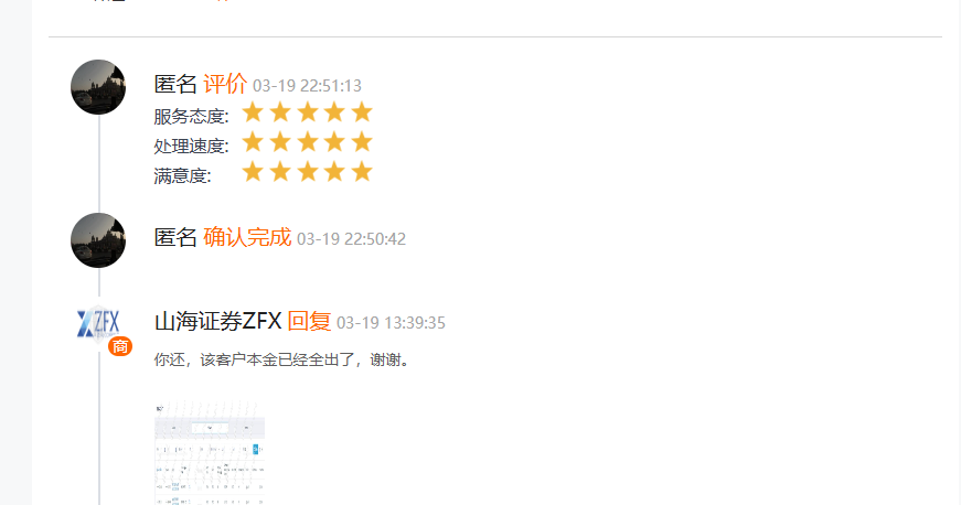 3月20日早,平台方再次联系斑马投诉反馈该用户的盈利和本金均全部到账,用户于3月19日晚上22:50分在斑马投诉上完成投诉,确认平台已经给了盈利和本金。并留言:山海外汇平台已经妥善处理我的所有诉求,并且已经完成相关出金,感谢山海平台。